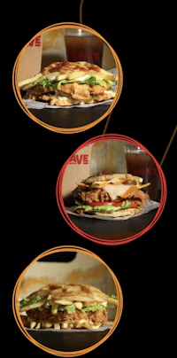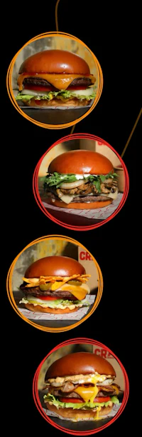 170g black Angus beef patty topped with crispy bacon. tangy Crave's sauce, a sunny side up egg, melted cheddar cheese, dill pickles, sliced tomato, crispy lettuce, and crunchy onion rings, all on a toasted bun